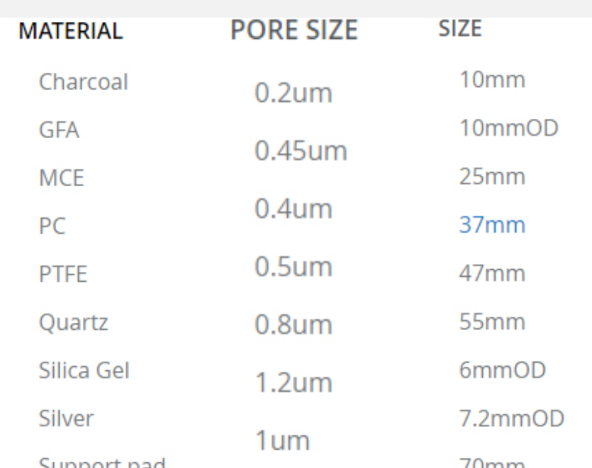 More infoFilters are available in a number of different materials, the most common type is Glass Fibre where gravimetric weighing is the only analysis. If further analysis is required or the hazard being sampled is corrosive or if there is interference with glass fibre then other types are recommended, e.g. Mixed cellulose ester (MCE), PVC, PTFE, Polycarbonate, Quartz, Silver
